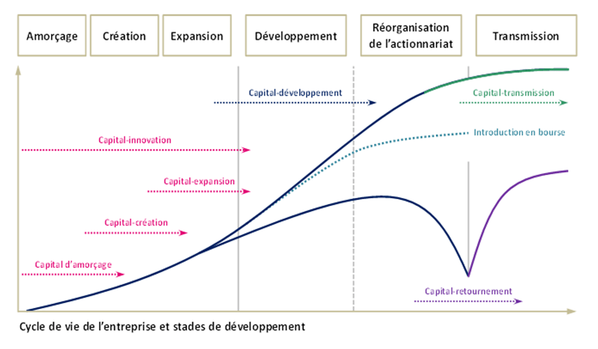 Le capital-risque peut être vu comme le prolongement de l’activité des business angels ; ces sociétés peuvent injecter plusieurs dizaines de millions de dollars dans un seul projet. Leurs pourcentages de participations dans une entreprise atteignent le plafond de 40%. Les sociétés de capital-risque peuvent intervenir à différents stade de vie d’une entreprise donnée. D’abord à l’amorçage et à la création, ensuite à la phase d’expansion et de développement et enfin à la réorganisation de l’actionnariat et à la transmission comme le montre le graphe ci-dessous.